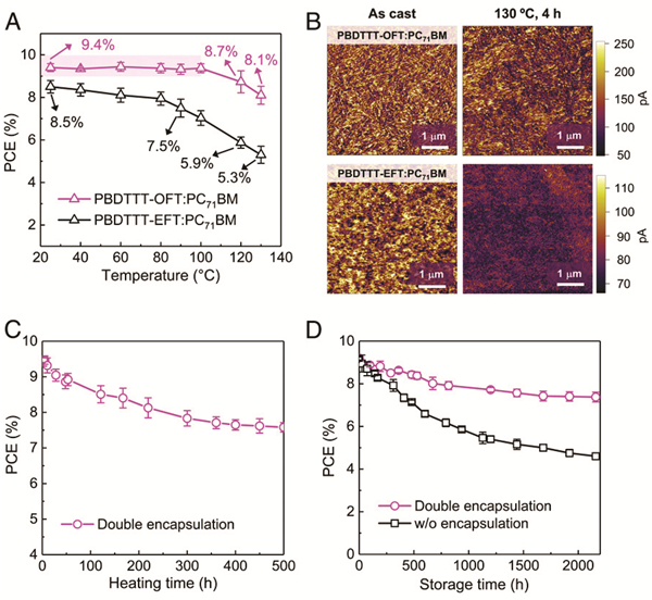 图3 超柔性OPV的热稳定的热稳定性和寿命图