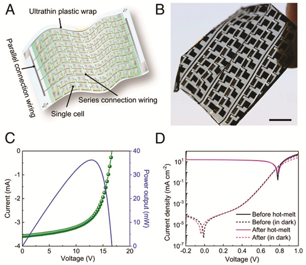 (A)五个并联阵列(每个阵列包含22个串联单电池)的超柔太阳能模块示意图;