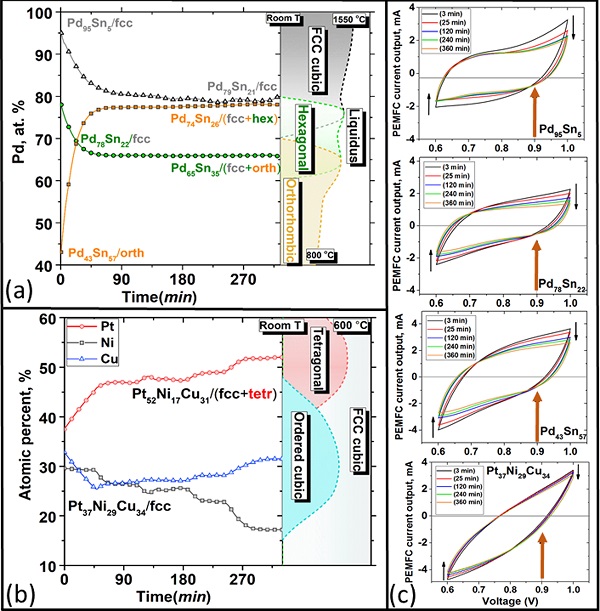(a)Pd-Sn的化学组成和纳米相类型的演变。 右边显示各批量对应物的相图;