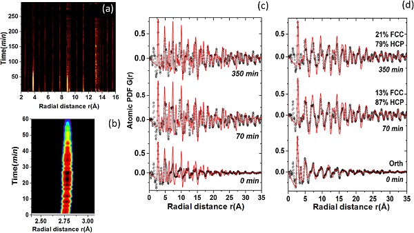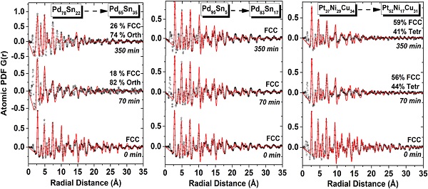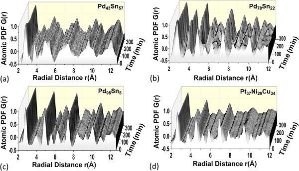 图2Pd-Sn和Pt-Ni-Cu纳米颗粒的操作原子PDF中与电化学循环的时间相比较。
