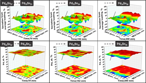 图5 PEMFC运行后获得的MEA的的Pd43Sn57纳米合金颗粒的质量分布和相同时间段内,相同MEA区域内Pd的实际百分比。