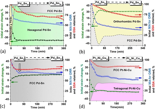 图4 未循环和循环Pd78Sn22,Pd95Sn5和Pt37Ni29Cu34合金纳米粒子的纳米相分析。
