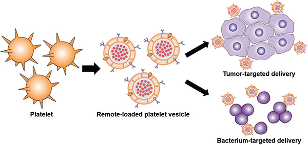 使用血小板作为起始材料,制备富含胆固醇的膜囊泡,并远程负载小分子治疗剂。所得的药物纳米制剂具有血小板结合标记物,因而可以用于靶向各种疾病相关底物,包括癌细胞和细菌。