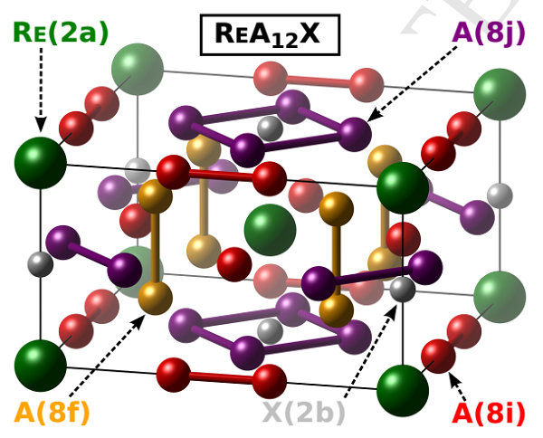 图1:用Wyckoff位置表示的REA12X结构的晶体结构。对称等价的A原子的连接键选用更明显的表示。