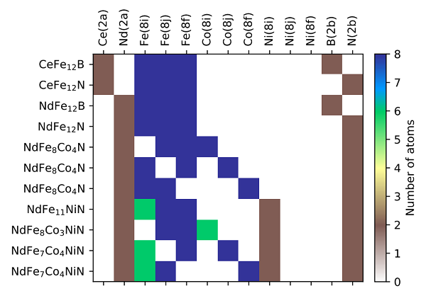 图2:所选的RE(Fe,A)12X化合物的描述符的图示。