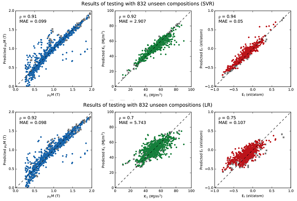 图4:用于表征含Nd化合物的μ0M、K1和Ef的SVR模型和LR模型的测试。