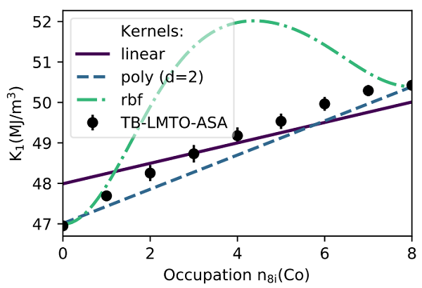 图5:通过未知组成的NdFe12-z/2Coz/2N和TB-LMTO-ASA结果的比较,kernel函数对K1预测的影响。