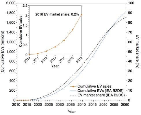 图1. 国际能源署“高于2摄氏度方案”中提出的电动汽车销售和电动汽车市场共享演进图
