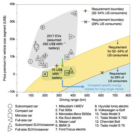 发展新能源汽车是各国的国家战略抉择,但是在减缓气候变暖的大格局下,电动汽车的发展仍然不尽如人意,如图1所示。锂离子电池是当前最具实用价值的电动汽车动力来源,然而它的低能量密度和高成本远远不能满足未来的电动车市场需求。例如在2016年的一项调查中发现,美国消费者中超过一半的人难以接受购买续航里程280公里以下且超过普通燃油车价格5000美元的电动汽车。令人遗憾的是,图2表明目前市场上仍未出现完全满足如上需求的电动车。虽然锂离子电池包预计2030至2040年能降至70美元/千瓦时,但即使是最具性价比的三款电动汽车仍有三成左右的消费者不愿意购买。除了价格因素,锂离子电池包的安全性和快充能力仍然需要进一步提高以获得市场更为广泛的接纳。