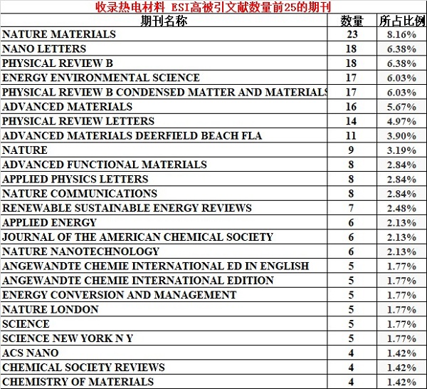 在收录热电材料的期刊中,哪些期刊收录的ESI高被引文章更多呢?(注:ESI高被引文献是由汤森路透根据ESI收录期刊引文数量统计的22个学科在10 年内被频繁引用,总被引次数与同年度,同学科发表论文相比排名位于全球前1%的论文)