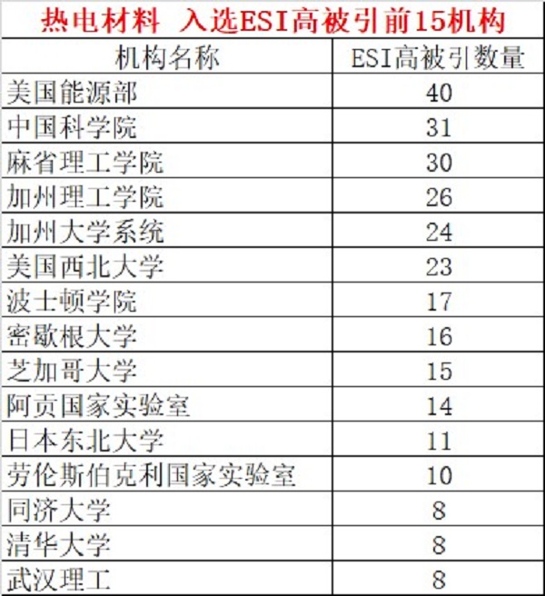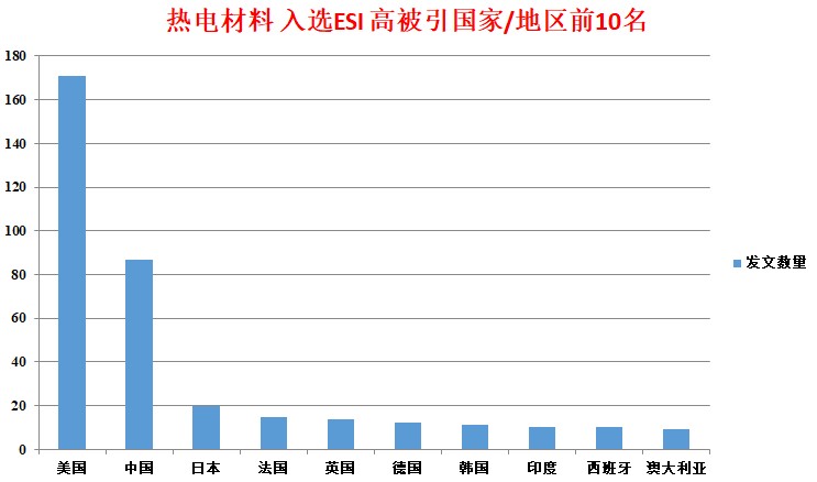 热电材料入选ESI高被引的文章共280篇,其中美国以171篇的数量,占总数的61.07%。中国大陆、日本和法国,分别以87、20和15篇的数量位列第二到第四名。这样看来,美国的高质量文章产率相对较高,相比美国,我国在热电领域的研究还需努力。可以说,在热电材料领域,中美的研究占据了世界的半壁江山。但是,在发文前10的国家/地区中,俄罗斯和中国台湾未再进入高被引前10名,反而西班牙,澳大利亚却进入了高被引文章数量的前十名。因此,相比于单纯地依靠发文数量来评价研究水平或研究贡献的高低,是不客观的,我们更应该结合高被引文章的数量来综合评价和分析。
