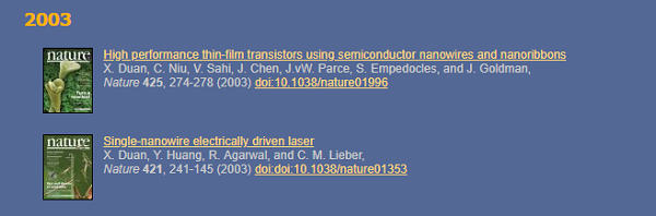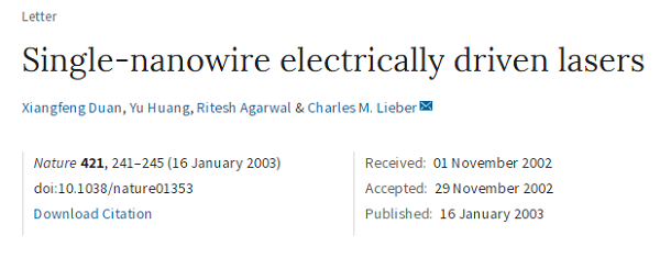 | Single-nanowire electrically driven laser | 2003 | Nature | 10.1038/nature01353 |