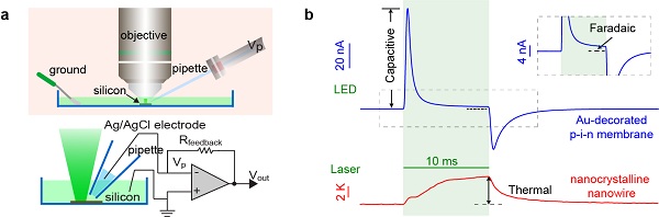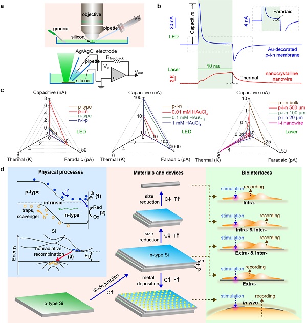 针对每一种光响应,作者们都优化出了最佳的材料条件,包括光热效应最强的同轴硅纳米线,仅有光致电容电流的二极管硅膜,和光致电容电流和法拉第电流都最高的金修饰二极管硅膜。针对每一种硅材料,作者都设计了匹配的生物体系来实现光控响应。