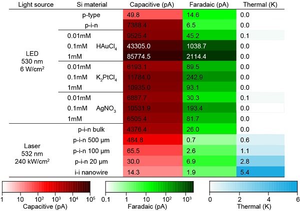 简单来说,当起始的硅膜从单纯的p型变成了p-i-n结型结构后,由于二极管显著的内电场导致的载流子分离,光致电容电流可以提高两个数量级。当利用伽伐尼置换反应沉积上一层金薄膜后,光致电容电流会进一步提高一个数量级,而光致法拉第电流也同时提高了两个数量级。最后,当硅材料从微米尺度的硅膜缩小为纳米尺度的硅纳米线后,光电效应会趋向于零,而载流子符合导致的光热效应则随材料尺寸的减小而逐渐变大。