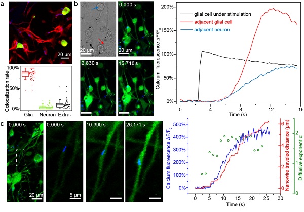 对于硅纳米线,作者们发现其几乎只会被胶质细胞吞噬,而神经元则几乎完全不能内吞。当用激光照射一个胶质细胞内的纳米线时,胶质细胞体内的钙离子流动可以被定点激活,而且产生的钙波还可以依次传播到周边的胶质细胞甚至神经元内。这一发现证明了,将来可能使用胶质细胞内吞的硅纳米线进行间接的神经元活动调节的可能性。