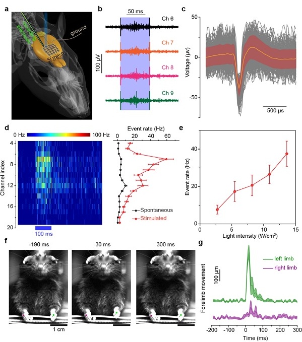图7:基于柔性硅网实现的光控脑活性和前肢运动