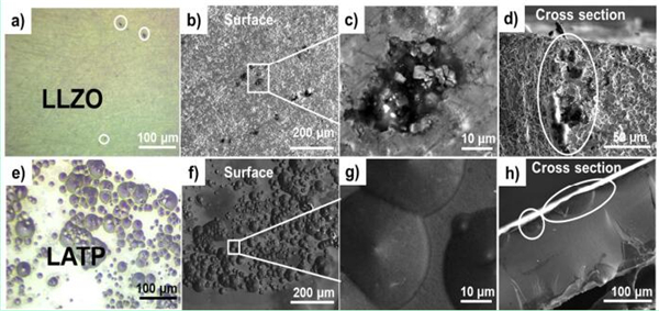 (a,e)LLZO和LATP循环后表面的光学图像;
