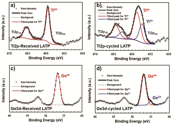 (c,d)循环前后,Ge3d的 XPS图谱。