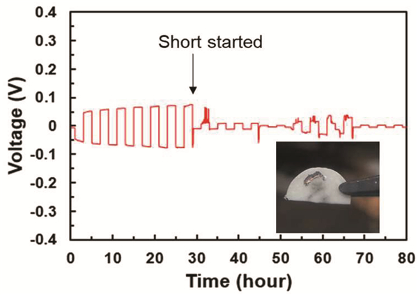 在0.1mA cm-2的电流密度下,Li/LLZO/Li对称电池的循环性能图。(插入图是循环后,电池中LLZO颗粒的光学照片)。