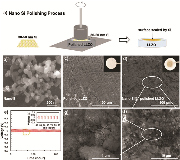 (e)在0.1mA cm-2的电流密度和室温条件下,纳米Si抛光LLZO作为SSE,Li/SSE/Li对称电池的循环性能图。(插入图是循环到50-80圈的放大图)