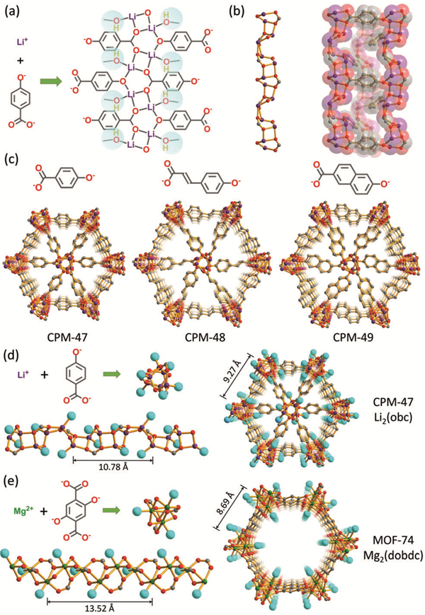 近日,美国加州大学Pingyun Feng和加州州立大学Xianhui Bu(通讯作者)等人,获得了棒包Li的有机框架结构(CPM-47、CPM-48、CPM-49)。这些材料具有极高的客体键Li位点密度,和不寻常CPM系列中的同心螺旋杆包装,这与在MOF-74中通过相反螺旋度的螺旋进行异螺旋杆包装不同。这一工作表明在无机-有机多孔材料中,开发高密度客体结合金属位点的新化学和结构可能性。相关成果以“Homo-Helical Rod Packing as a Path Toward the Highest Density of Guest-Binding Metal Sites in Metal-Organic Frameworks”为题发表在Angew上。