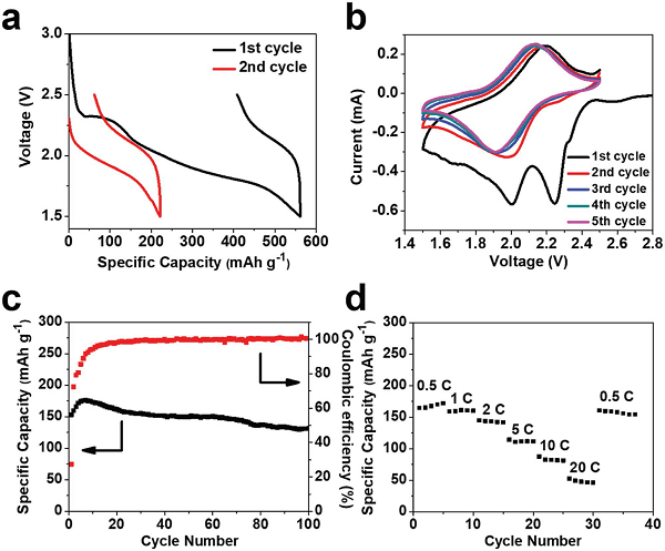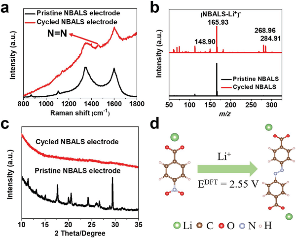 近日,马里兰大学王春生(通讯作者)团队基于硝基化合物向高性能锂离子电池偶氮化合物的电化学转化设计了一种新的化学物质。选择4-硝基苯甲酸锂盐(NBALS)作为模型硝基化合物,系统研究了硝基化合物的结构,锂化/脱锂机理和电化学性能。NBALS在0.5C时的初始容量为153mAh g-1,100次循环后保持131mAh g-1的容量。详细表征表明,在最初的电化学锂化过程中,结晶NBALS中的硝基不可逆地还原为无定形偶氮化合物。随后,偶氮化合物在充电/放电循环中以高电化学性能可逆地锂化/脱锂。偶氮化合物的锂化/脱锂机理也通过直接使用偶氮化合物作为电极材料来验证,所述电极材料表现出与硝基化合物类似的电化学性能,同时具有更高的初始库仑效率。 相关成果以题为“Azo Compounds Derived from Electrochemical Reduction of Nitro Compounds for High Performance Li‐Ion Batteries”发表在了Adv. Mater.上。
