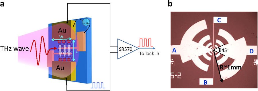 电磁频谱中,太赫兹辐射是指频率在0.1 THz到10 THz范围的电磁波,恰好处于微波电子学与红外光子学之间,由于其特殊的频率范围在天文、遥感、生物医学等领域具有重要的应用前景。为实现太赫兹光子的高效能量转换材料需要具备高吸收、高转换的特点,而工作温度、太赫兹光子低能特性限制了传统光子能带探测方法在未来便携式太赫兹检测系统、通讯系统的广泛应用。纯电子学的通过减小特征尺寸方法往太赫兹波段延伸面临着弹道效应、量子隧穿等不利因素限制了器件的工作效率。单原子石墨烯材料所具备的高迁移率和零禁带特性,为太赫兹器件集成在诸如可穿戴电子设备、柔性医学设备的应用提供了天然条件。当太赫兹光子入射到石墨烯材料表面,石墨烯材料对太赫兹呈现出高吸收态,其表面电子呈现出相应的无序高动能态,而这一部分能量往往难以转化成有用的信号被支撑衬底、电极等以热的形式耗散,因此如何实现高效的器件设计实现太赫兹能量转换至关重要。