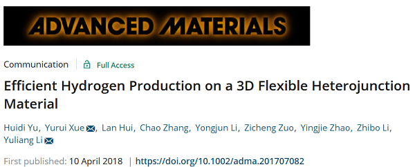 近日,Advanced Materials上刊登了题为“Efficient Hydrogen Production on a 3D Flexible Heterojunction Material”的文章。文章的通讯作者为中国科学院化学研究所李玉良院士和薛玉瑞研究员,文章的第一作者为余晖迪。
