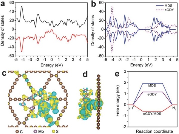 为了研究催化剂的物质组成,研究人员对其进行XRD及XPS表征。eGDY在25.6°和43.3°具有衍射峰。在14.3°,33.7°,39.8°和59.3°的衍射峰对应于MDS的(002),(100),(103)和(110)。由于两者之间的相互作用,与MDS相对应的峰相对于较小的角度向轻微展宽转变。为了证明这种转变, X射线光电子能谱(XPS)测量谱显示eGDY/MDS存在Mo,S和C。与纯eGDY相比,290.0 eV附加的π-π*峰值显示了离域π共轭的恢复。sp和sp2杂化碳原子的面积比为2,证实了水热法生长MDS后eGDY结构的完整性。对于纯MDS,Mo和S的自旋轨道分离是3.2和1.2 eV,意味着Mo4+和S2-的存在。对于eGDY/MDS,Mo3d3/2,Mo3d5/2,S2p1/2和S2p3/2峰移动至较低的结合能,可能是由于MDS和eGDY之间的电子相互作用。此外, eGDY的拉曼光谱中1384.7和1590.5 cm-1处对应于D和G带的峰,以及由于共轭二炔链的振动而产生的1926.2和2189.8 cm-1处的峰。eGDY/MDS在378和409 cm-1处显示出两个附加峰反映了MDS的面内E2g1模式和面外A1g模式,表明eGDY成功合并和MDS相位。由于eGDY和MDS之间形成化学键,可以诱导出峰位于2152.1 cm-1处的明显的较低位移,对炔烃相关的伸缩振动是特异的。与eGDY相比(ID/IG=0.81),eGDY/MDS的ID/IG明显增加(0.98),表明eGDY/MDS缺陷增加以产生更多活性位点。实验结果表明存在电子相互作用发生在富电子石墨炔和MDS之间的界面,这非常有利于发挥异质结结构的内在活性。