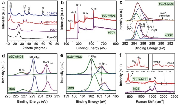 (d)Mo 3d、(e)S2p的eGDY/MDS和MDS的XPS;