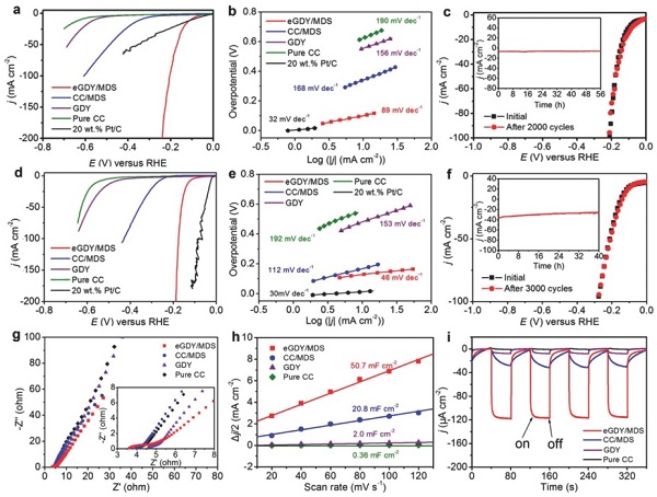 在该文中,研究人员从理论上和实验相结合证明,eGDY可以作为优化催化剂用于激活和优化HER的主体材料。首次将eGDY整合到TMDS中以获得在整个pH范围内具有高活性和稳定性的新型HER催化剂。获得的催化剂在10mAcm-2时显示出小的超电势值和Tafel斜率。碱性介质中eGDY/MDS的催化活性甚至优于Pt/C。 eGDY/MDS的较高固有活性来源于eGDY和MDS之间界面上的促进电子转移动力学,导致接近热中性的最佳ΔGH,从而促进了H2O分子的OH键的解离。此外,观察到eGDY/MDS的光响应性能的显着增强。该研究成果将eGDY与原始催化剂结合的策略可以成为开发具有高效性能的新催化剂的通用方法。石墨炔对过渡金属二硫族化合物之外的材料和不断增长的绿色能源领域有着深远的影响。