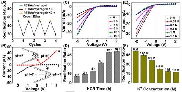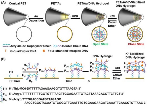 (a) 离子通道的制备过程示意图。金溅射到圆锥纳米通道的尖端,形成PET/Au。DNA水凝胶通过杂交链式反应组装在金覆盖的尖端,形成PET/Au/DNA Hydrogel,这种状态为“开”;当K+存在,水凝胶中的DNA转变为四聚体结构,形成坚硬网络结构(PET/Au/K+-Stabilized DNA hydrogel),这种状态被为“关”;当冠醚存在,它作为钾离子的螯合剂,导致G4-DNA结构解离,使其回到原始状态。
