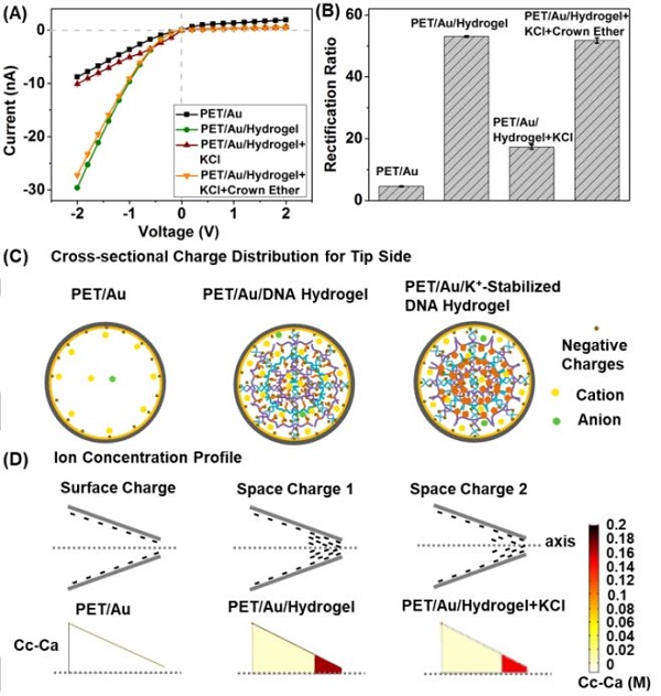 (c) 电荷分布的示意图:PET/Au,PET/Au/DNA Hydrogel,PET/Au/K+-Stabilized DNA Hydrogel尖端截面电荷分布的示意图,PET/Au纳米通道的负电荷仅在表面分布(表面电荷),而PET/Au/DNA Hydrogel的负电荷在整个尖端都有分布(空间电荷1),空间电荷可以增加纳米通道中对应的阳离子浓度和阳/阴离子比例,从而改善纳米通道中离子电流和整流比。而对于PET/Au/K+-Stabilized DNA Hydrogel纳米通道,由于部分负电荷的中和,分布在尖端的负电荷减少(空间电荷2)。