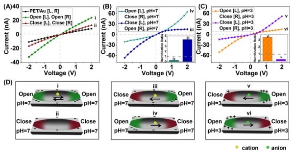 (c) 非对称修饰DNA水凝胶的纳米通道(PH=3)的I-V曲线和整流比。v:关/开状态时纳米通道;vi:开/关状态时纳米通道。仅允许阴离子通过并且传输方向可以转变。