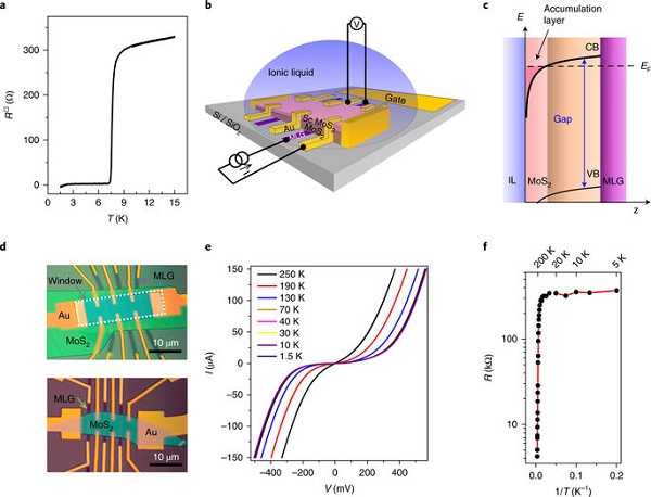 a: 在MoS2的表面处发生栅极诱导的超导性的电阻转变;