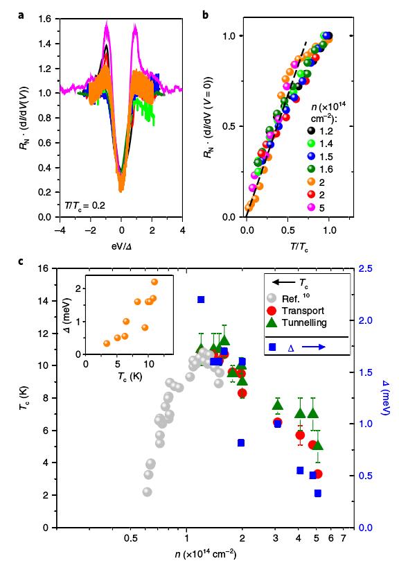 该团队的隧道谱学测量结果提供了有关闸门诱导超导态性质的相关信息,发现当作为eV /Δ的函数绘制低偏差隧道电导测量值时,与n的值无关,并且在V = 0V 所有数据与T/Tc绘图时的曲线相同,表明超导状态与探测到的密度范围相同。另外,隧穿电导对电压和温度的依赖性表明低能量DOS与E成线性比例。