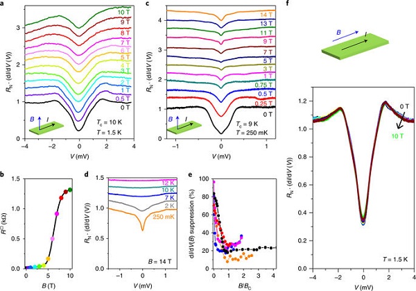 近日,来自日内瓦大学的Alberto F. Morpurgo(通讯作者)的团队在Nat. Nanotech发表了题为Tunnelling spectroscopy of gate-induced superconductivity in MoS2的文章,通过隧道谱来确定不同电子密度的能级依赖态密度,从而探索MoS2中的栅诱导超导。在超导状态下,DOS在能量小于间隙Δ的情况下受到强烈抑制,垂直磁场B在E <Δ处产生填充间隙的状态,但超导起源的20%的DOS抑制远远高于传输临界场。研究结果表明一种在栅诱导超导体上执行隧道谱学的策略,并展示了传统运输测量中无法获得的大量的信息。