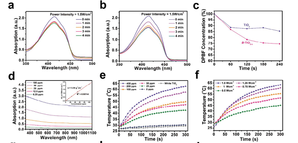 (f)B-TiO2-x在不同光照功率下的时间温度曲线。