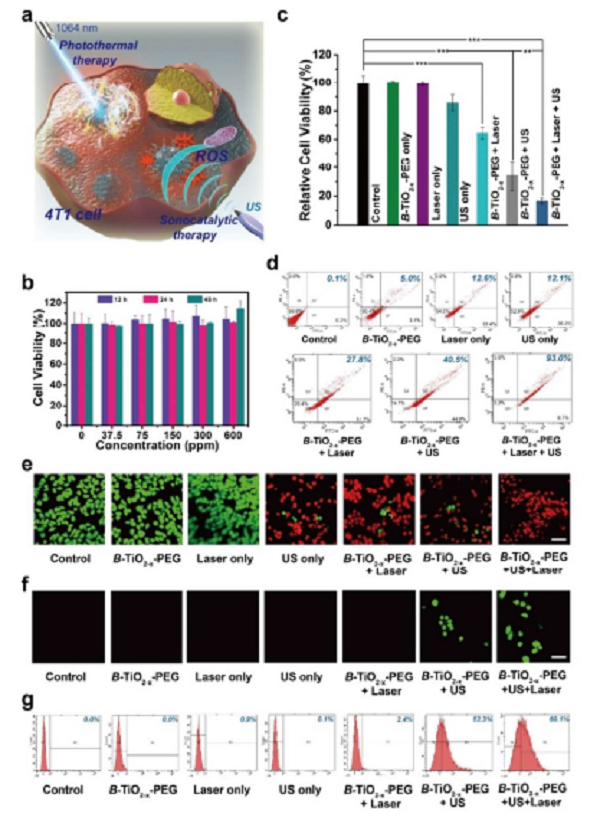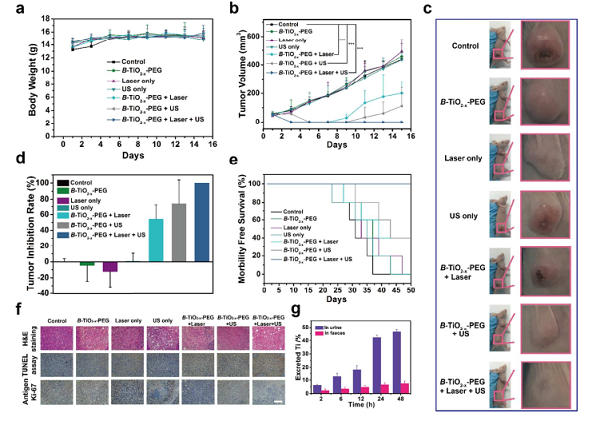 研究使用了一种合理的设计,使传统无机半导体TiO2表面形成一层有着大量氧缺陷的TiO2-x层。这种微妙的改变,使B-TiO2-x既在超声作用下能够有良好的声动力作用,在肿瘤环境中产生ROS诱导肿瘤细胞凋亡和坏死;同时,其也具有良好的光热性能(39.8%),达到热消融肿瘤的目的。SDT与PTT的协同效应显著增加B-TiO2-x-PEG的肿瘤治疗效应。这项研究成果为传统无机半导体在生物医学的应用中打开了新思路。
