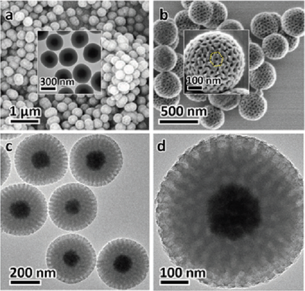 (a) Fe3O4@nSiO2 颗粒的扫描电镜图,插图为该颗粒的透射电镜图;
