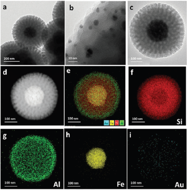 (e) 微球元素分布图; (f) 微球中硅元素的分布图;(g) 微球中铝元素的分布图;(h) 微球中铁元素的分布图;(i) 微球中金元素的分布图。