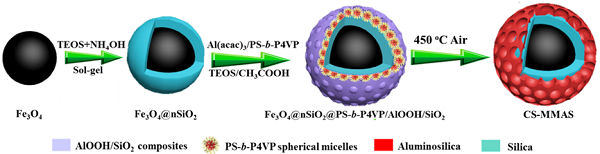 本研究报道了一种以两亲性嵌段共聚物PS-b-P4VP 诱导界面共组装的普适方法,成功地在磁性颗粒表面构建了具有单层大介孔多孔外壳。该方法可以构建具有不同外壳组成的核–壳磁性介孔微球,包括二氧化硅、硅铝酸盐、氧化锆/二氧化硅复合材料等。这些具有不同表面性能的大介孔复合微球材料在生物富集与分离、非均相催化等诸多领域具有广泛的应用前景。该工作得到复旦大学化学系、聚合物分子工程国家重点实验室、2011能源材料化学协同创新中心(iChEM)以及国家万人计划青年拔尖人才支持计划和国家自然科学基金优秀青年基金的大力支持。