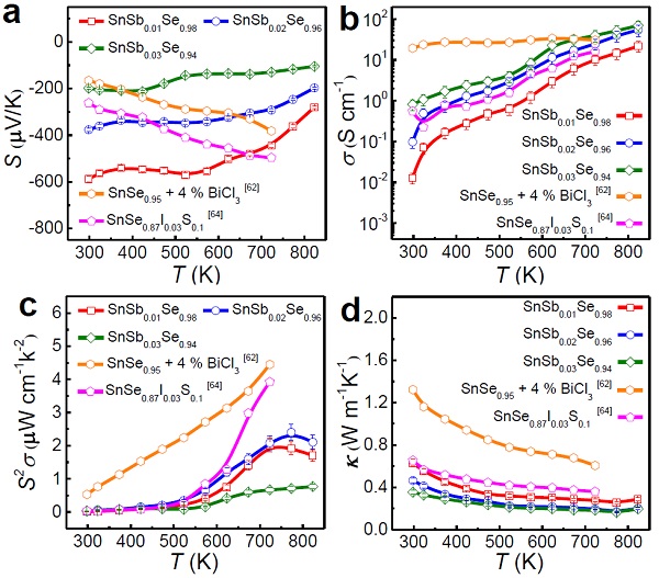 图6. 经由不同锑掺杂量的硒化锡SnSbxSe1-2x微晶烧结的块体材料的随温度变化的热电性能:(a)塞贝克系数,(b)电导率,(c)功率因子,以及(d)热导率。