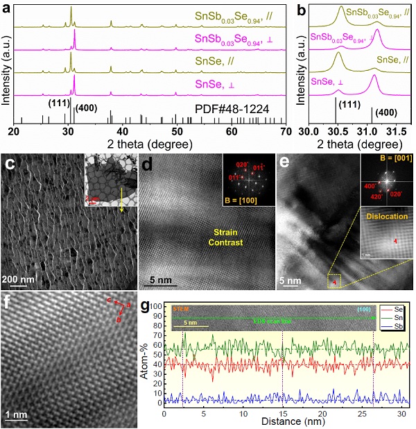 图8. (a):经由纯SnSe和锑掺杂的SnSb0.03Se0.94微晶烧结的块体材料的XRD结果对比(平行与垂直烧结压力方向上的结果均有对比),(b):放大的(111)和(400)峰以显示其由掺杂所导致的峰偏,(c):经由SnSb0.03Se0.94块体上切割下来的薄片的透射电子显微镜照片,(d): 向的高分辨照片以及其FFT 图案,(e): 向的高分辨照片以及其FFT 图案和一个典型的位错. (f):沿a轴得到的球差高分辨透射电子显微镜照片以显示锑元素掺杂所导致的原子位置偏移,(g):在(f)上进行的EDS线扫描结果以显示锑原子代位硒原子。