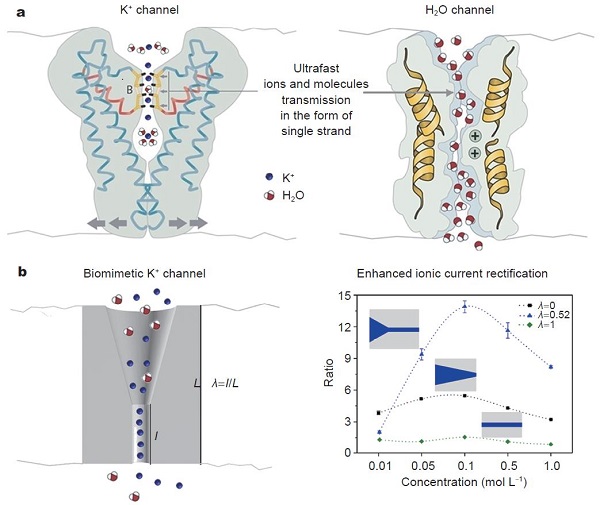 图1 生物离子通道和人工离子通道均存在超快离子和水传输。