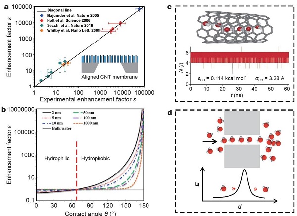 (a)文献中水流速增加系数的实验数据拟合, 插图表示阵列化的碳纳米管膜。(b)不同纳米通道直径的水流速增加系数与接触角的关系。(c)分子动力学模拟碳纳米管中水链的结构以及纳米管内水分子的数量随时间变化的关系。(d)超快水传输以有序水分子链方式通过纳米通道的示意图,以及提出的“量子隧穿流体效应”概念。