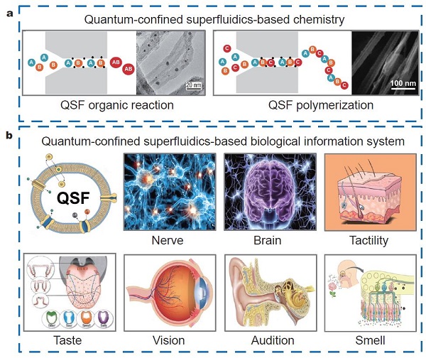 (a)QSF有机反应:碳纳米管限域的Fischer-Tropsch合成可将合成产率提高一个数量级;QSF聚合反应:合成具有超高分子量和更高密度的线型聚乙烯结晶纳米纤维。(b)QSF概念对于深入理解神经和大脑的超快信号传递具有重要意义,为理解触觉、味觉、视觉、听觉和嗅觉的生理过程提供新的思路,促进QSF生物化学,生物物理,生物信息学以及生物医学等学科的发展。