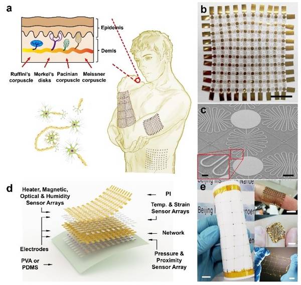 人体皮肤是一个活跃、非常敏感和高弹性的感觉器官,主要承担着保护身体、排汗、温度调节、感知冷热和压力等功能。人体躯体感觉系统能够通过皮肤中的触觉、温度、痛觉等感受器将外界环境刺激转化为电脉冲信号,经过神经通路传导至神经中枢,从而使皮肤获得触觉、痛觉等感觉功能。基于皮肤这种多功能生物模型,科学家们开展了一门新兴学科研究——触感电子学(俗称“电子皮肤”,Electronic skin, E-skin),用来模仿皮肤的感觉功能如触觉、温度感知等功能。目前,电子皮肤是在柔性或弹性基底上制作具备探测压力、温度或其他刺激的传感器及阵列,能够感知周围环境中的多种物理、化学、生物等信号,将有助于开发新型人机接口、智能机器人、仿生假肢等智能化系统。电子皮肤的重要发展趋势是:多功能化以及多重刺激同步监测。近日,来自中国科学院北京纳米能源与系统研究所潘曹峰研究员、王中林院士的研究团队报道了一种柔性可拉伸扩展的多功能集成传感器阵列,成功地将电子皮肤的探测能力扩展到7种,实现了温度、湿度、紫外光、磁、应变、压力和接近等多种外界刺激的实时同步监测。