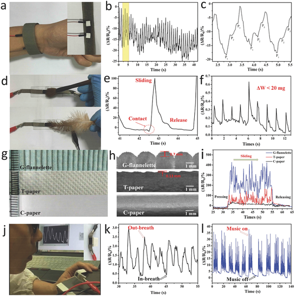 大学宋远强副教授、张怀武教授和哈尔滨工业大学解维华教授(共同通讯作者)研究小组联合研发出一款可同时感应压力和摩擦力的柔性电子皮肤。研究者通过制备特殊的石墨烯包裹氯化钠(GO@NaCl)粉体作为致孔剂辅助自组装过程制备了基于CNTs/GO@PDMS复合三维导电网络的电子皮肤。该电子皮肤可同时对纵向压力和切向摩擦力产生响应,并且压力和摩擦力导致的电阻变化方向相反。该电子皮肤尤其对摩擦力具有极佳的灵敏度(在1KPa压力下,摩擦力灵敏度因子高达2.26)。在功能应用上,所制电子皮肤可以实现手腕脉搏实时检测、辨别不同表面粗糙度、探测人体呼吸、感知音乐带来的空气震动等。