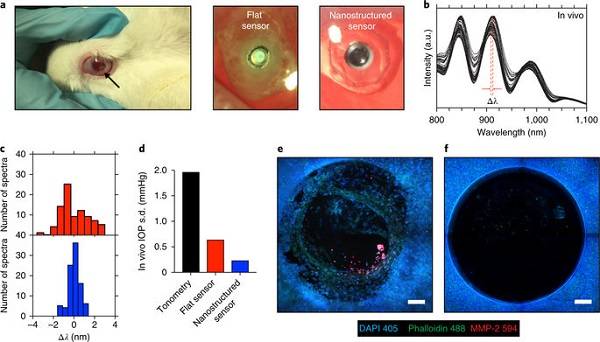 据调查发现,估计有8-10%的美国人(5-6%在其他发达国家)在他们的一生中,都需要依靠植入的医疗设备来维持身体机能。因此,开发医疗植入技术的努力一直在增加。然而,对这些努力的一种主要挑战是,要求在严格限制的范围内具有多种功能,同时必须确保在体内性能和可靠性能方面可以接受。工程多功能表面的灵感通常来自于自然界,它拥有大量的纳米结构,具有广泛的理想特性。在自然界中,许多活的生物体都拥有能够为生存提供颜色和其他多种功能的光子纳米结构。虽然这些结构已经在实验室中进行了积极的研究和复制,但目前尚不清楚它们是否可以用于生物医学应用。近日,美国加州理工学院的Hyuck Choo教授和加利福利亚大学的David Sretavan教授(共同通讯作者)等报道了一种透明的双光子纳米结构,它受到长尾玻璃翅蝴蝶(Chorinea faunus)的启发,并展示了它在体内的眼压(IOP)传感器的使用。利用两种非混相聚合物(聚甲基丙烯酸甲酯和聚苯乙烯)相分离,在Si3N4基质上形成纳米结构的特征。因此形成的膜具有良好的角质性白光透射性、强亲水性和抗生物活性,防止蛋白质、细菌和真核细胞粘附。并且,他们用制备的光子膜作为光学传感元件,研制了一种微型的植入式IOP传感器。最后,通过在新西兰白兔体内进行的活体检测,表明制备的设备在没有炎症迹象的情况下,降低了IOP的平均测量偏差。